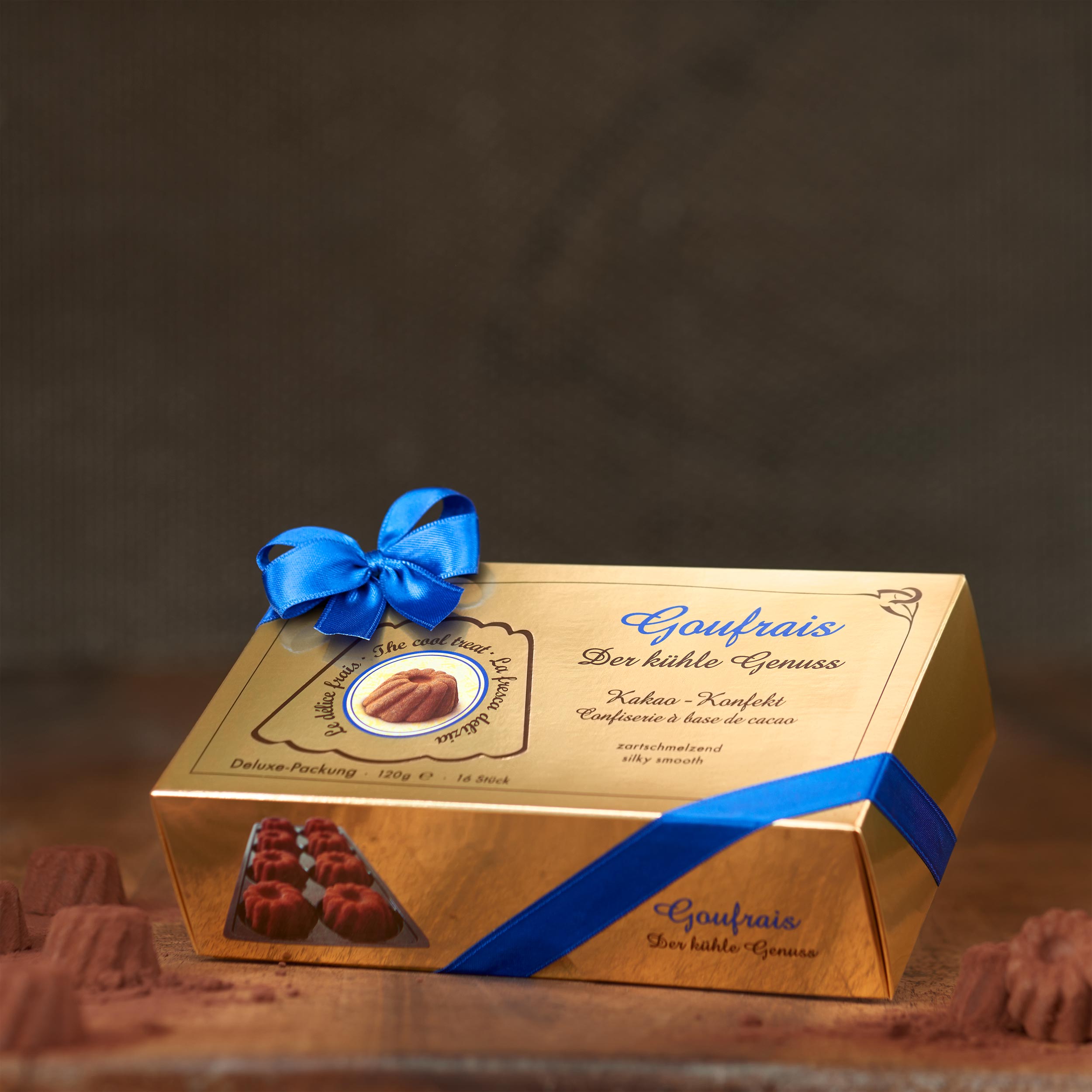 In unserer luxuriösen Deluxe-Packung feiern 16 Goufrais ihren ganz persönlichen glamourösen Auftritt. Jedes zartschmelzende Kakao-Konfekt in Gugelhupfform ist einzeln in einem Blister eingelegt und präsentiert sich von seiner besten Seite. Der kühle Genuss, umhüllt von 100%-igem Kakao-Puder, ist eine wahre Gaumenfreude und dabei alkoholfrei, nussfrei und glutenfrei.