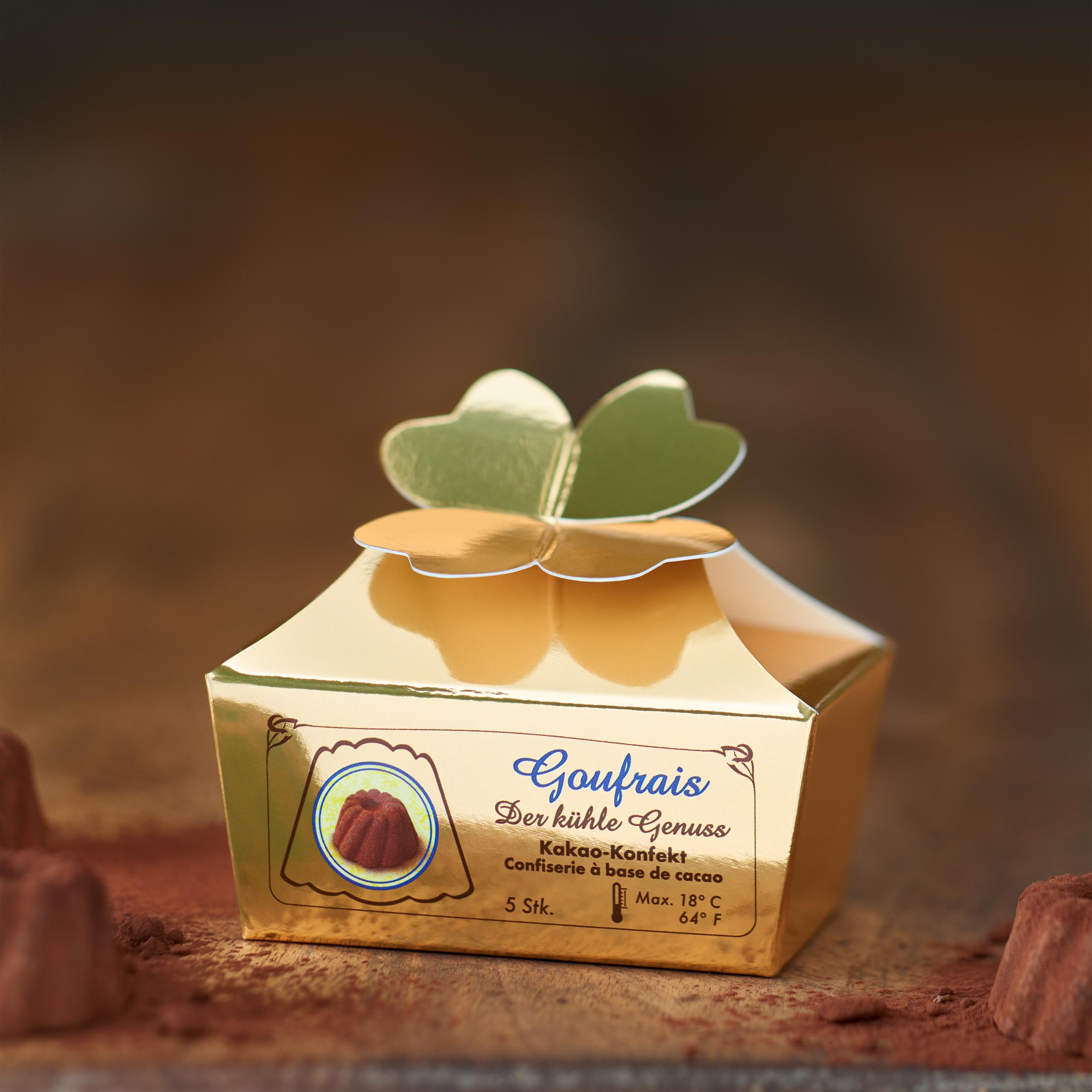 GOUFRAIS ist ein weltbekanntes Kakaokonfekt, das durch seine exzellente Qualität und die einzigartige Gugelhupfform besticht. Die Produktion erfolgt im Dreiländereck von Deutschland, Frankreich und der Schweiz, wo handwerkliches Können und die Leidenschaft für Schokolade aufeinandertreffen.
