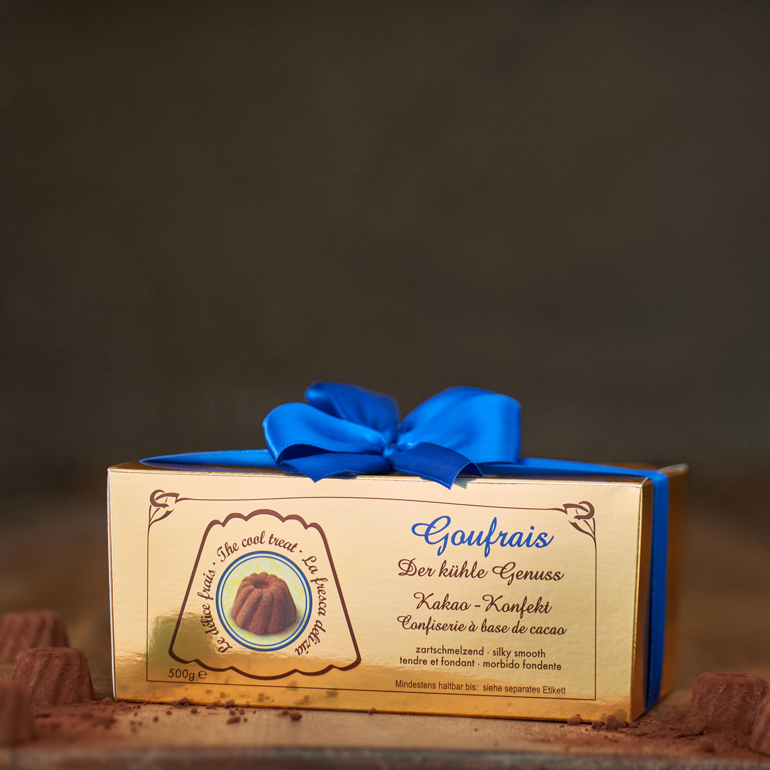 Zeigen Sie sich großzügig: Die goldschimmernde Schatzkiste mit eleganter blauer Schleife enthält 67 Goufrais und ist ein exklusives Geschenk für echte Genießer.