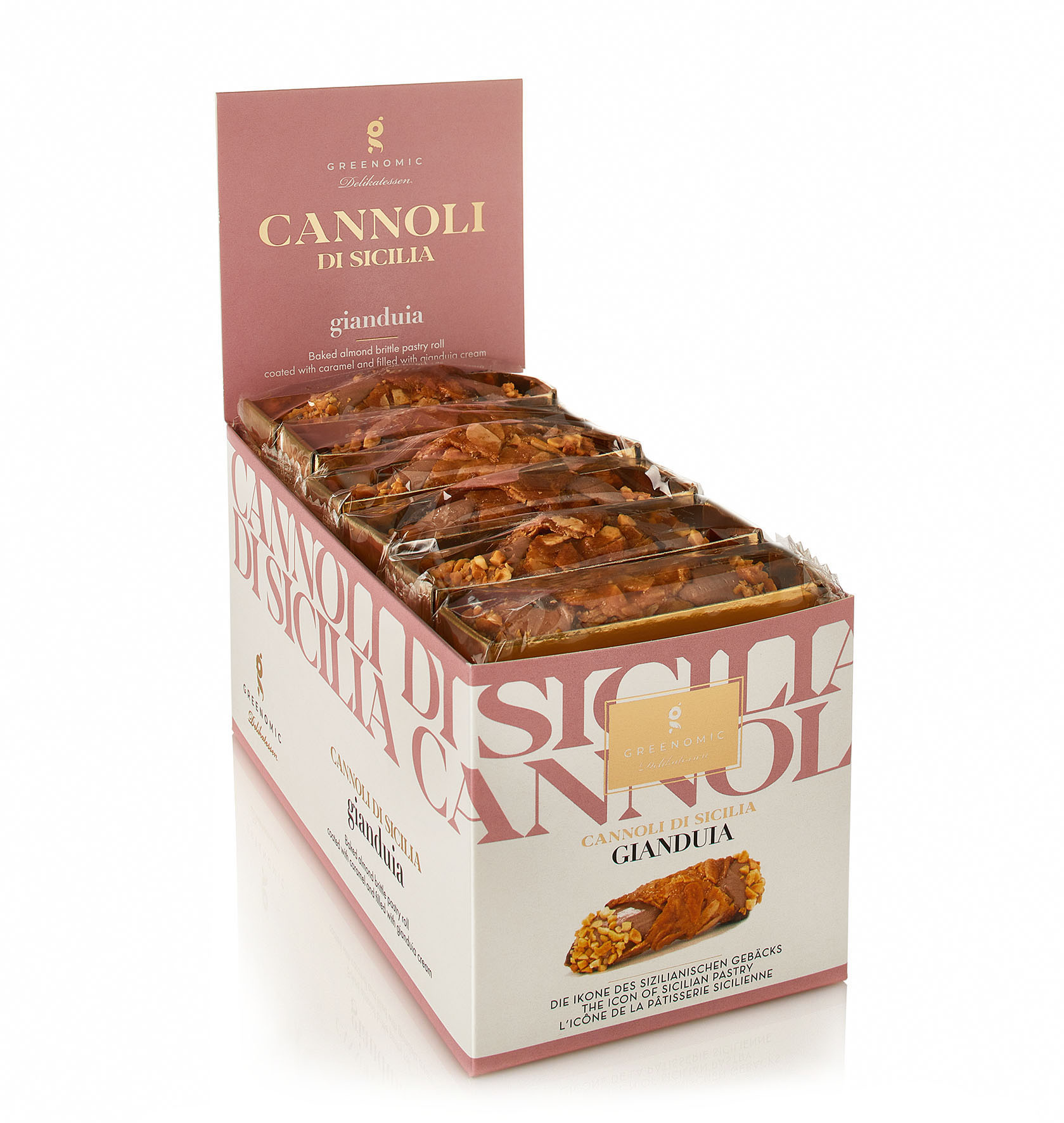 Genießen Sie mit den Cannoli di Sicilia Delicious Gianduja den unvergleichlichen Geschmack von Mandelkrokant und Haselnusscreme – eine luxuriöse Delikatesse, die italienische Tradition und edle Zutaten in jedem Bissen vereint!