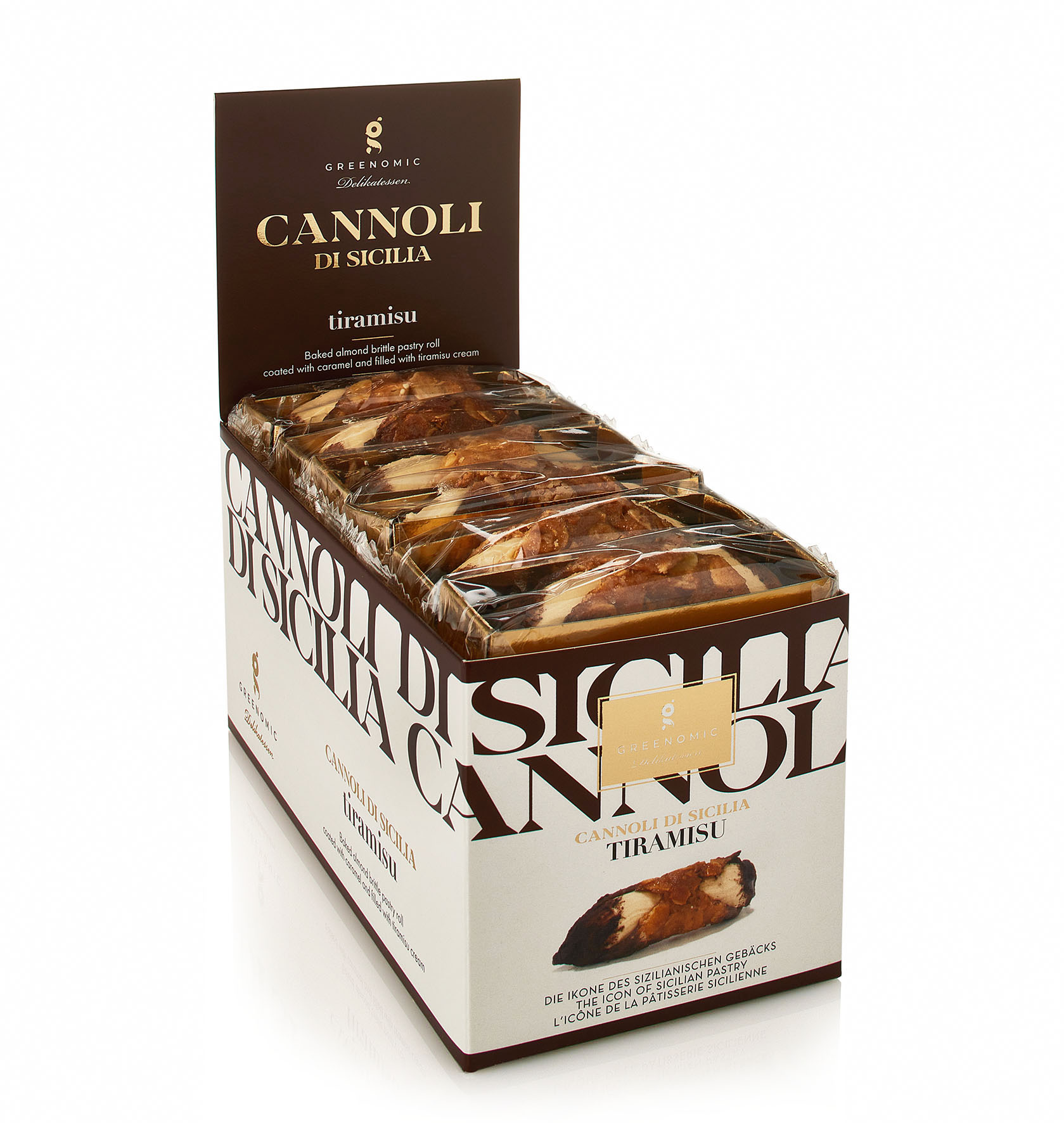 Erleben Sie mit den Cannoli di Sicilia Delicious Tiramisù die perfekte Kombination aus knusprigem Mandelkrokant und samtiger Tiramisù-Creme – ein echter Genuss für Liebhaber italienischer Süßspeisen!