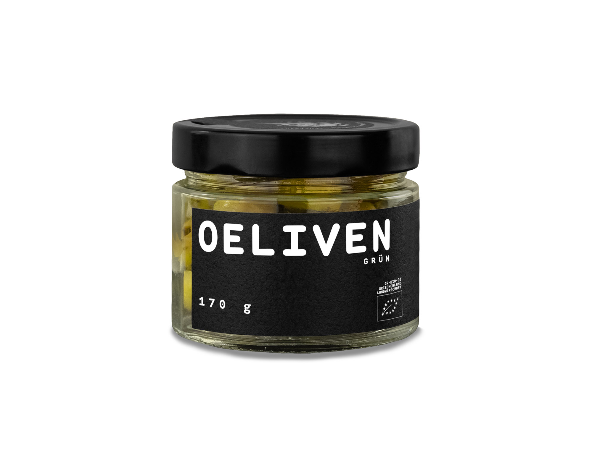 Das 170g Glas, gefüllt mit biozertifizierten Chalkidiki-Oliven ( 100% )