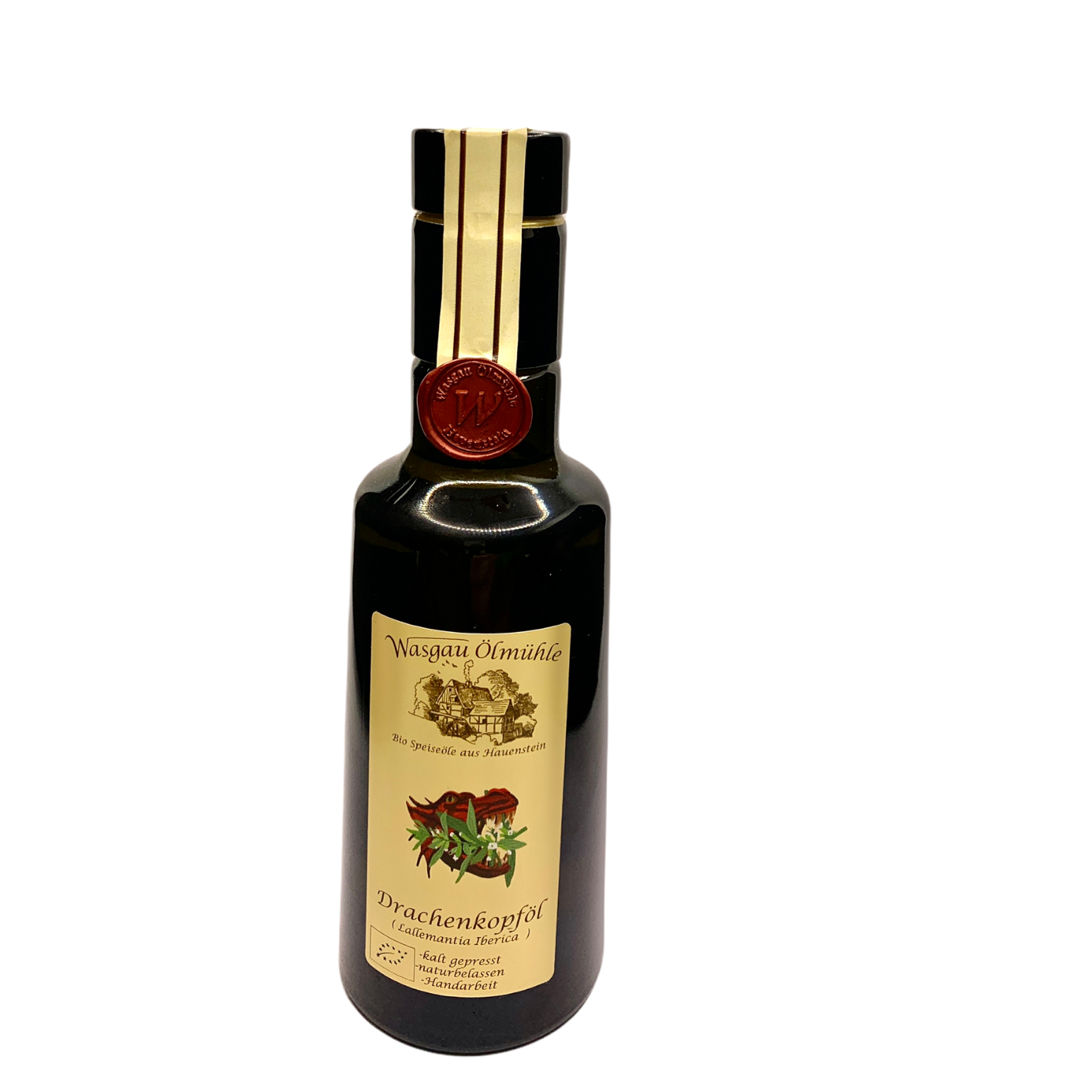 Der iberische Drachenkopf wird heimisch angebaut und ergibt ein erstklassiges Speiseöl. Sein delikater Geschmack erinnert auf dezente Weise zugleich an frische Kräuterwiesen wie auch an elegante Nussnoten und Kürbis. Im Geruch kommt ein angenehmer Duft frischer Nüsse zur Geltung. Seine kristall-grüne Farbe ähnelt einem grünen Turmalin. Mit seinem Anteil von ca. 52% essentieller Omega-3-Fettsäuren ist es dem Leinöl gleichzusetzen. Auch das Verhältnis von Omega-3 zu Omega-6 von 4:1 ist ausgezeichnet. Damit sorgt Drachenkopföl für eine einmalige Abwechslung bei der Versorgung mit hochwertigen Fettsäuren. Es passt hervorragend zu heimischen Salaten, Pilzgerichten, Gemüse, Müsli und einfachen Kartoffelgerichten.
