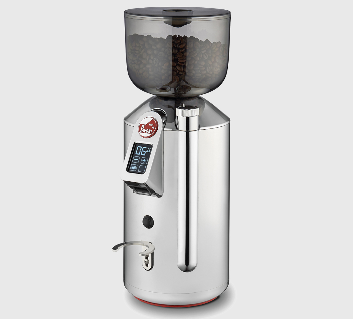 Neue La Pavoni Mühle mit elegantem Design, Körper aus verchromtem Aluminium, Bohnenbehälter in Tritan 600 g Fassungsvermögen, LCD-Display zur Auswahl verschiedener Mahlprogramme.