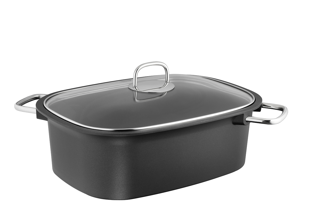 Griffe und Deckel: Handliche Edelstahlgriffe und ein hitzebeständiger, bruchsicherer Güteglasdeckel erleichtern das Kochen und Sichtbraten.
