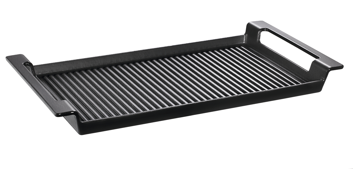 Mit Maßen von 44 x 24 cm bietet die Grillplatte ausreichend Platz für größere Portionen. Die spezielle Grillrippenstruktur sorgt für das beliebte Grillmuster und lässt Fett und Bratensaft ablaufen, was zu einer gesünderen Zubereitung beiträgt. Die handlichen Gussgriffe erleichtern das Handling, egal ob auf dem Herd, im Backofen oder auf einem Grill.
