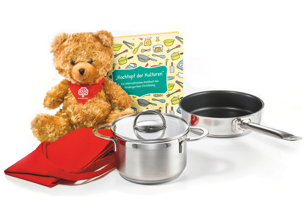 Zusätzliche Geschenke: Ein kuscheliger Teddy, eine kindgerechte Schürze und das Kochbuch "Kochtopf der Kulturen", das 43 internationale Rezepte enthält. Diese sind einfach nachzukochen und machen das Kochen zu einem spannenden Abenteuer für Kinder.