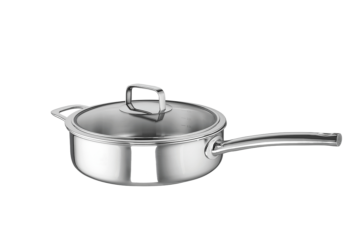 Die Schmorpfanne Skagen repräsentiert eine ideale Kombination aus Funktionalität, Design und Energieeffizienz. Gefertigt aus einem hochwertigen 3-Schicht-Material, das Edelstahl und Aluminium kombiniert, garantiert diese Pfanne eine hervorragende Wärmeleitung und -verteilung von Boden bis zum Rand, was das Schmoren und Braten von großen Portionen oder mehreren Beilagen erleichtert.
