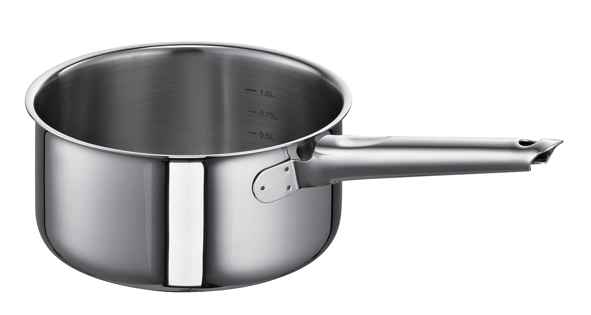 Ein besonderes Merkmal des Stieltopfs ist die praktische Innenskalierung, die Ihnen das genaue Dosieren erleichtert. Zusätzlich verfügt der Topf über einen stabilisierenden Schüttrand, der ein sicheres und sauberes Abgießen ermöglicht. Diese durchdachten Details machen den Stieltopf Romana i zu einem unverzichtbaren Helfer in Ihrer Küche.