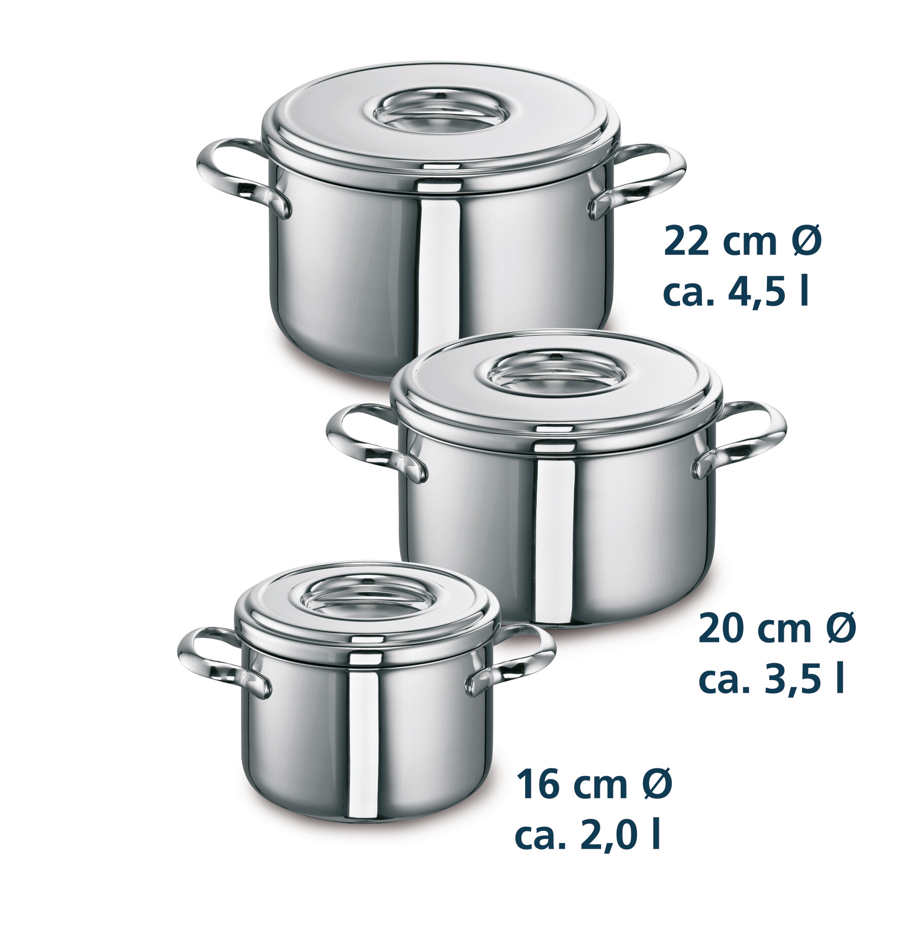 Das Set enthält drei Töpfe in verschiedenen Größen, die für eine Vielzahl von Kochanwendungen geeignet sind: