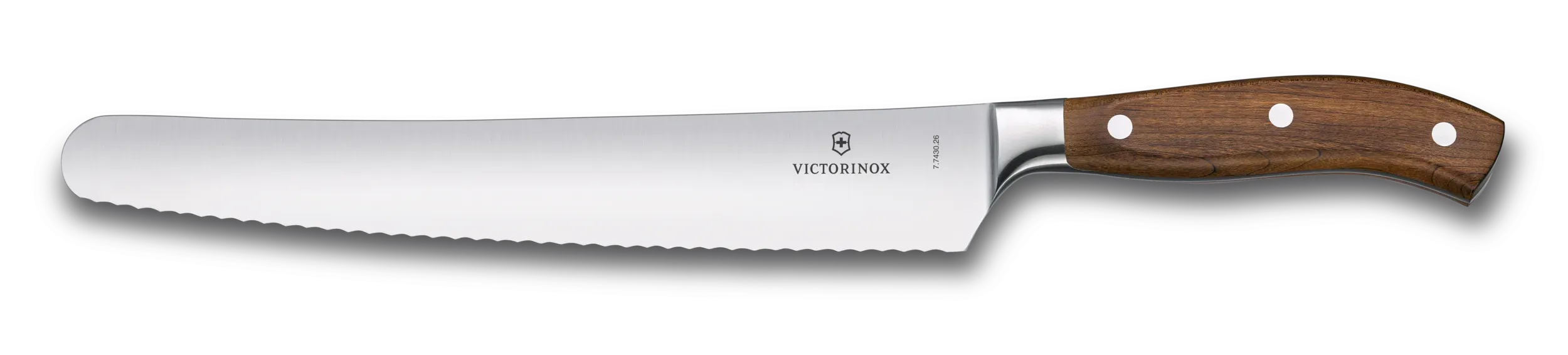 Das Grand Maître Brot- und Konditormesser von Victorinox vereint zeitloses Design mit höchster Funktionalität. Es gehört zur geschmiedeten Messerlinie und verfügt über eine Full-Tang-Klinge, die gleichmäßig gehärtet und perfekt ausbalanciert ist. Diese Klinge mit ihrem extra scharfen Wellenschliff gleitet mühelos durch knusprige Brotlaibe und Backwaren, ohne zu sägen – ideal für den täglichen Einsatz, ob im privaten oder professionellen Umfeld.