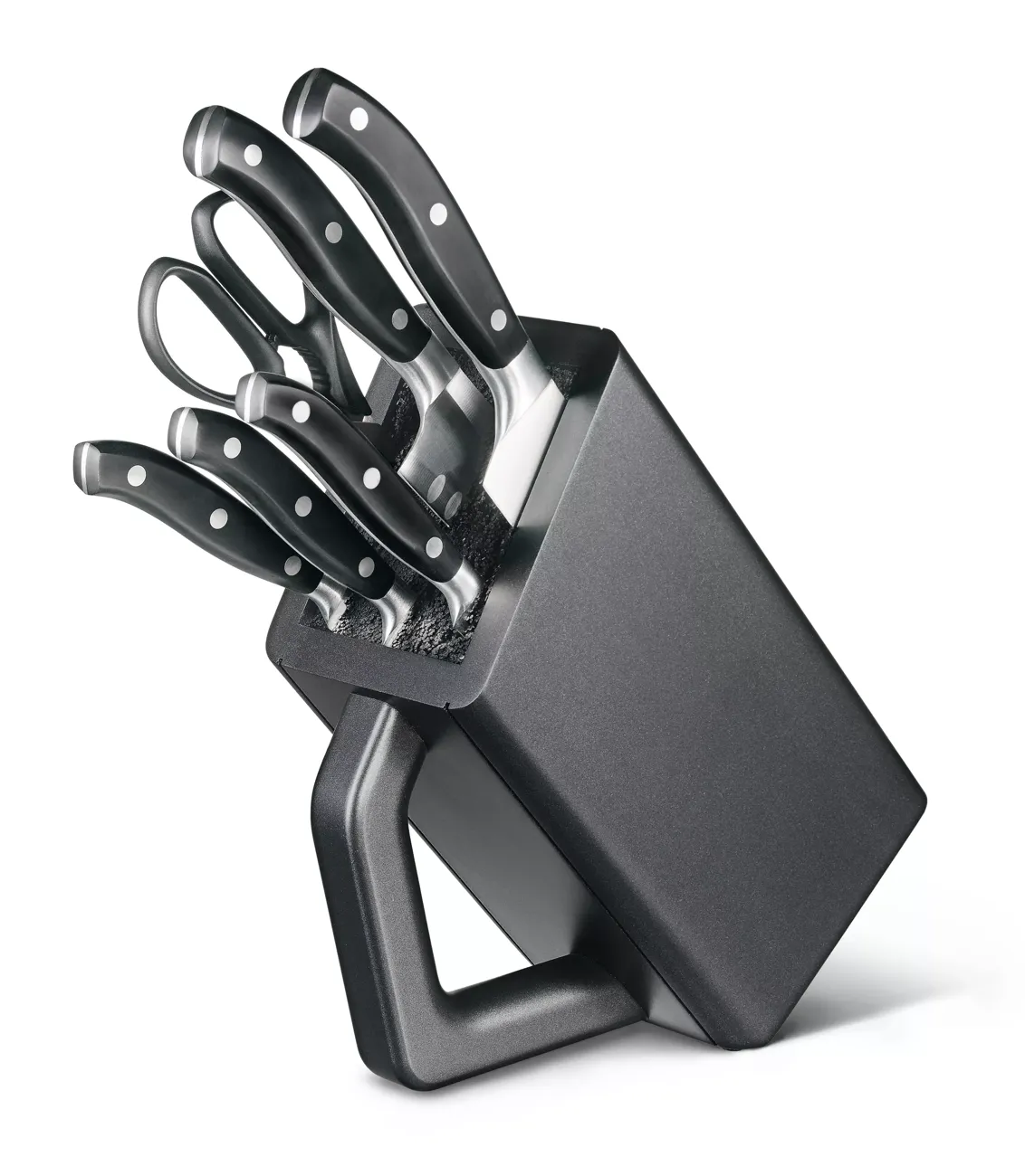 Das sechsteilige Set der Grand Maître Messerlinie von Victorinox vereint außergewöhnliche Qualität und zeitlose Eleganz. Der Übergang von der Klinge zum Griff ist bei jedem Messer nahtlos, und der Kropf, der eine Verdickung des Stahls an dieser Stelle darstellt, sorgt für mehr Sicherheit, indem er ein Abrutschen der Hand zur Klinge verhindert. Die Messer dieses Sets sind perfekt ausbalanciert und bestehen aus einem hochwertigen, geschmiedeten Stück.