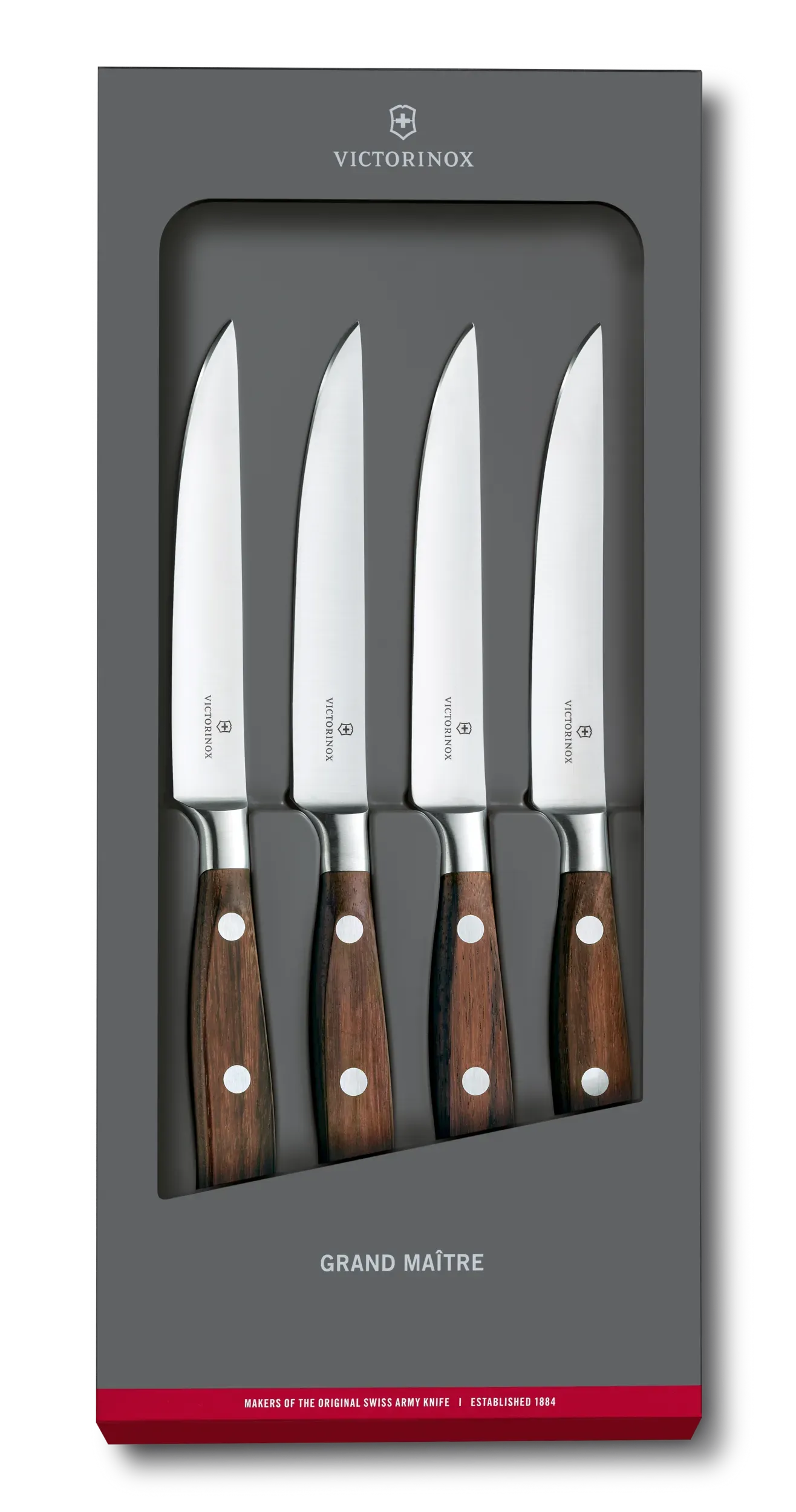 Das formschöne und zugleich hochfunktionelle Grand Maître Steakmesser der geschmiedeten Messerlinie von Victorinox verfügt über eine Full-Tang-Klinge, die gleichmässig gehärtet und perfekt ausgewogen ist. Es ist aber nicht nur die Klinge, die dem Steakmesser seine robuste Stärke verleiht – sein Holzgriff zeugt ebenfalls von Eleganz und Robustheit. Der von Hand polierte und ergonomische Griff liegt angenehm in der Hand und verspricht eine erleichterte Anwendung auf unbegrenzte Zeit. Die hochwertigen Steakmesser dieses vierteiligen Sets schneiden Steaks und anderes Fleisch mühelos. Ideal für den privaten wie auch professionellen Einsatz. Mit diesem eleganten Tafelbesteck werden Sie Ihre Gäste beeindrucken.