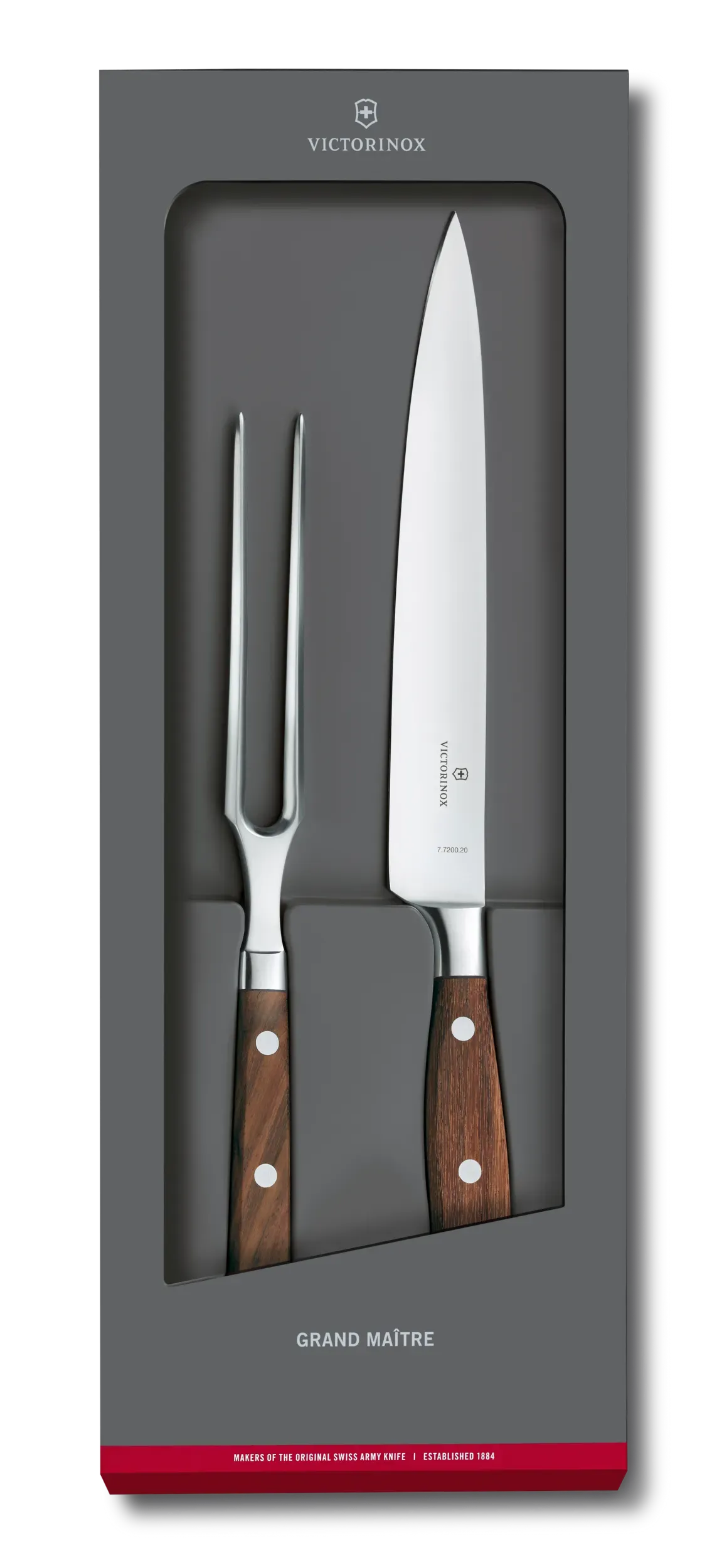 Dieses wunderschöne und perfekt abgestimmte Grand Maître Tranchier-Set erfüllt die höchsten Ansprüche von Hobby- und Profiköchen gleichermaßen. Es besteht aus einem Tranchiermesser und einer Tranchiergabel, die Teil der geschmiedeten Full-Tang-Messerlinie von Victorinox sind. Beide Werkzeuge bestechen durch einen eleganten, von Hand polierten Holzgriff, der ergonomisch gestaltet wurde, um auch bei längeren Schneidarbeiten maximalen Komfort zu bieten.