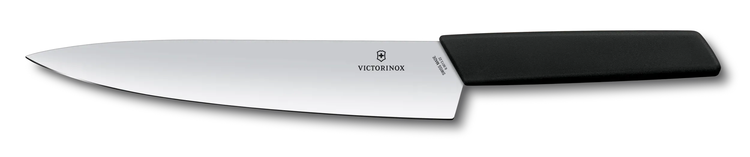 Das Swiss Modern Kochmesser mit 22 cm langer Klinge ist das ultimative Küchenwerkzeug für jeden, der Wert auf Effizienz und Präzision legt. Egal, ob Sie Schweineschultern, Roastbeef oder Steak tranchieren oder feine Schnitte bei anderen Fleischsorten anstreben – dieses Messer erledigt jede Aufgabe mit Leichtigkeit. Dank des geraden Schliffs und der extra scharfen Edelstahlklinge gleitet es mühelos durch Fleisch und sorgt für saubere, gleichmäßige Schnitte.