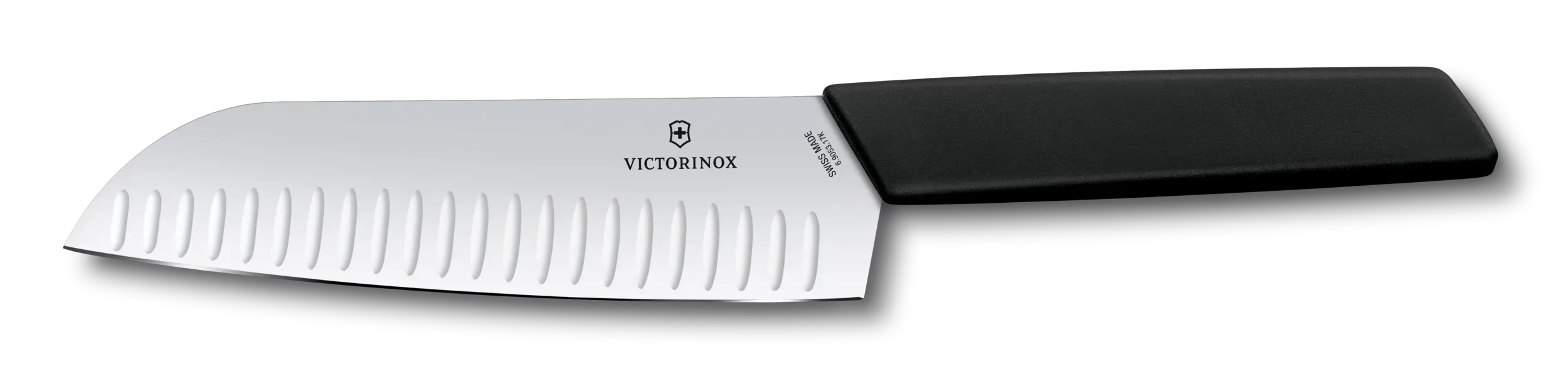 - Schweizer Präzision: In der Schweiz gefertigtes Santokumesser mit Kullenschliff für müheloses Schneiden.