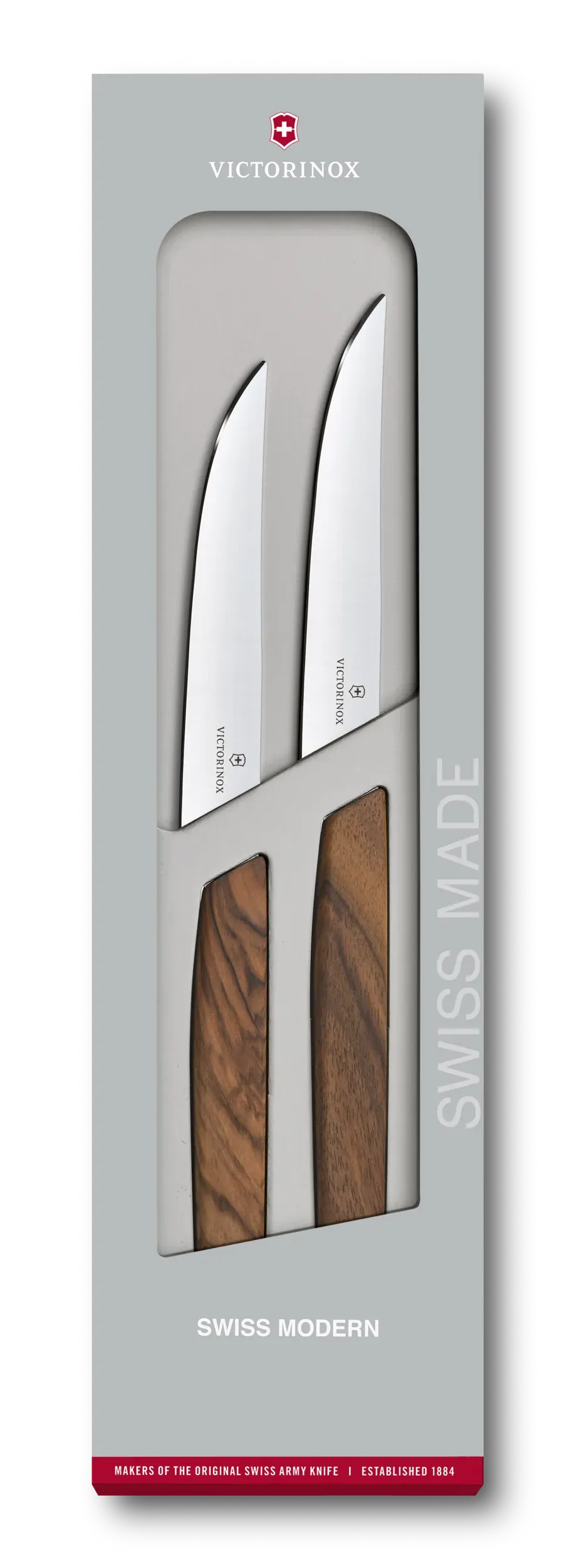 Mit dem Swiss Modern Steakmesser-Set von Victorinox sind Sie perfekt ausgestattet, um Schnitzel, Steaks und Filets mühelos zu schneiden. Diese zwei Tafelmesser zeichnen sich durch ihre scharfen, geraden Klingen und die ergonomisch geformten Griffe aus wunderschön gemasertem europäischem Nussbaumholz aus. Der warme, natürliche Griff liegt perfekt in der Hand und verleiht dem Messer ein angenehmes, komfortables Handling. Die geometrische Form des Griffs harmoniert ideal mit der 12 cm langen Klinge und verleiht dem Messer einen modernen und zugleich zeitlosen Touch.