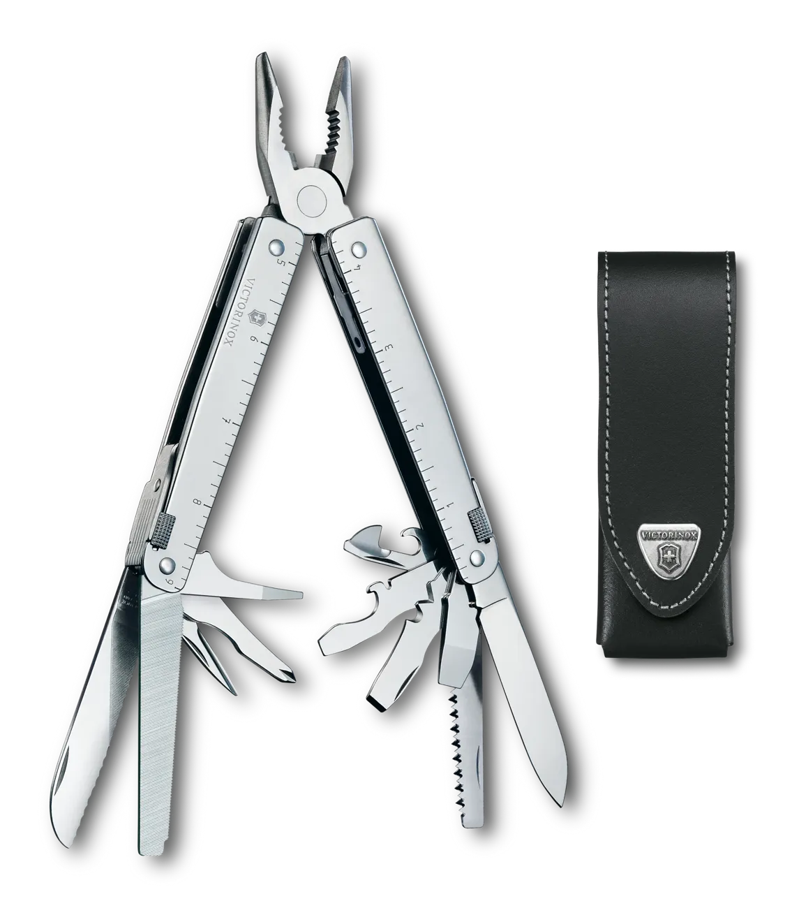 Das Swiss Tool ist ein vielseitiges Multitool, das durch seine Robustheit, Funktionalität und kompakte Bauweise besticht. Ob für alltägliche Aufgaben oder anspruchsvolle Projekte, dieses Tool liefert immer zuverlässige Leistung. Mit seinen feststellbaren Werkzeugen ist es ideal für den sicheren und präzisen Einsatz, und dank des mitgelieferten Lederetuis haben Sie es immer griffbereit.