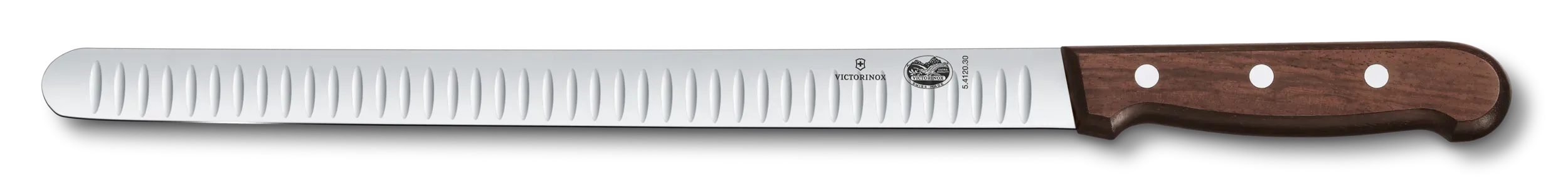 Das Lachsmesser von Victorinox ist ein wahres Meisterwerk der Präzision. Mit seiner langen, dünnen und flexiblen Klinge, die auf beiden Seiten mit einem Kullenschliff versehen ist, ermöglicht es Ihnen, hauchdünne Scheiben zu schneiden – genau so, wie es für perfekten Lachs notwendig ist. Dank der flexiblen Klinge schneiden Sie mühelos nahe an den Gräten und nutzen jeden Teil des Fisches optimal aus. Ihre Gäste werden von der Präzision und Eleganz Ihrer Schnitte beeindruckt sein.